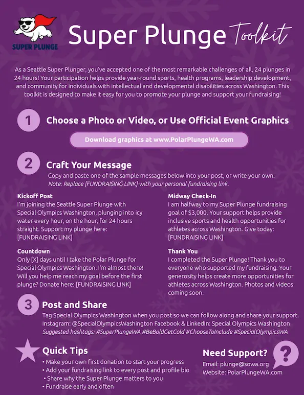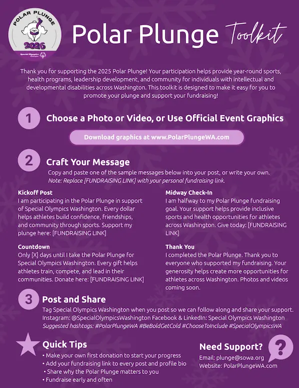 I’m taking the Polar Plunge Washington for Special Olympics Washington! ❄️Help me reach my [$XX] goal and support athletes with intellectual and developmental disabilities. 💙Donate here 👉 [YOUR PERSONAL FUNDRAISING PAGE] #PolarPlungeWA #BeBoldGetCold #SpecialOlympicsWA